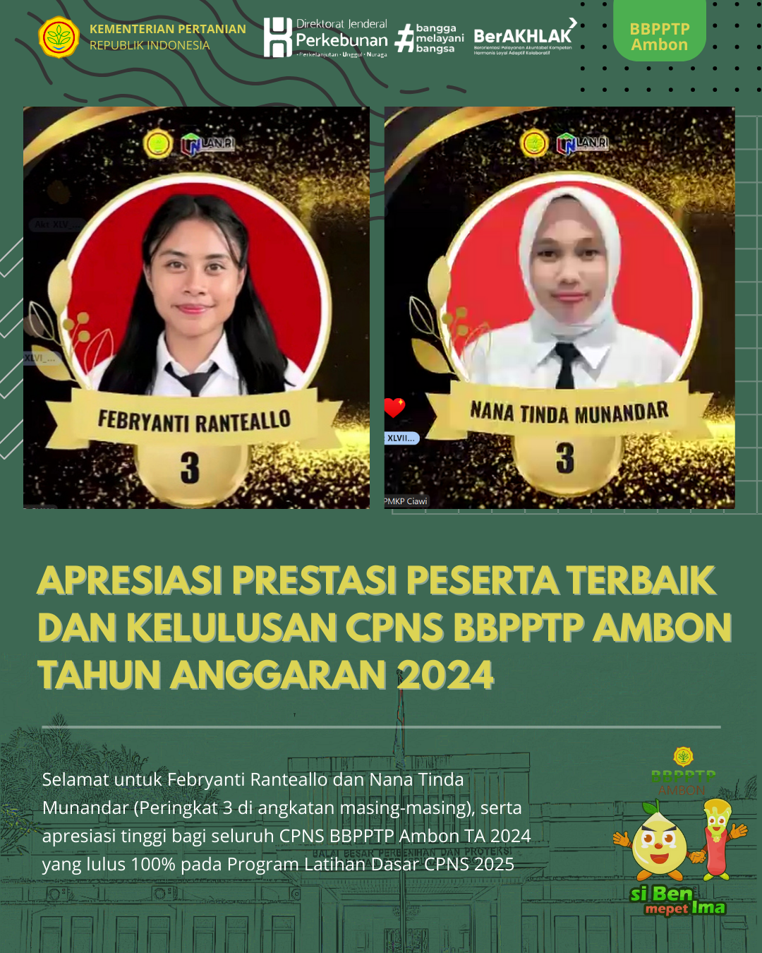 Selamat juga atas kelulusan 100% seluruh CPNS BBPPTP Ambon TA 2024. Keberhasilan ini adalah bukti nyata komitmen dan dedikasi dalam mencetak ASN yang berkualitas.