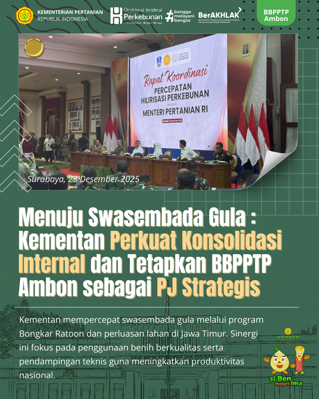 Diposting Rabu, 24 Desember 2025 12:12 pmSURABAYA, 23 Desember 2025 — Kementerian Pertanian (Kementan) mempercepat konsolidasi internal untuk mencapai target swasembada gula nasional. Melalui rapat koordinasi Ditjen Perkebunan dan BBPPTP Ambon, pemerintah memfinalisasi strategi percepatan program Bongkar Ratoon dan Perluasan Lahan Tebu di Jawa Timur.
