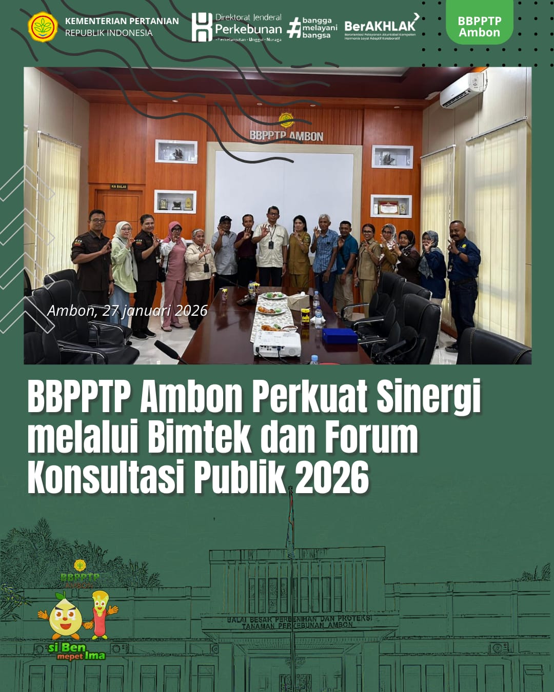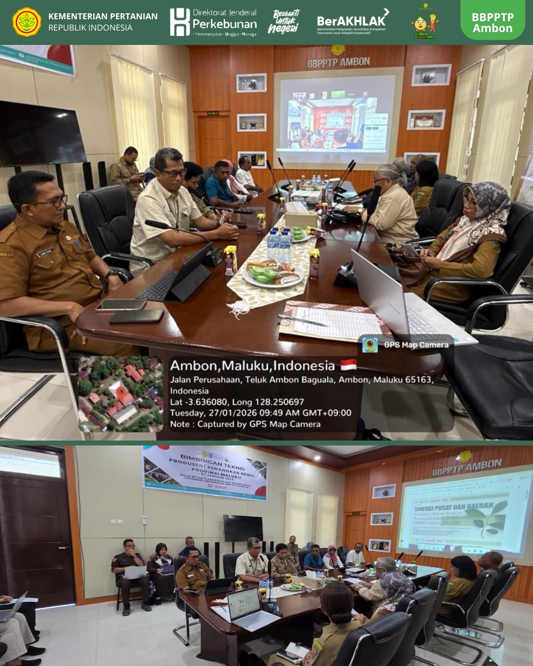 Diposting Selasa, 27 Januari 2026 03:01 pmAMBON – Balai Besar Perbenihan dan Pelindungan Tanaman Perkebunan (BBPPTP) Ambon menyelenggarakan kegiatan Bimbingan Teknis (Bimtek) bagi Produsen/Penangkar Benih sekaligus Forum Konsultasi Publik (FKP) Tahun 2026 di Ruang Rapat BBPPTP Ambon, Selasa (27/01/2026). Pertemuan strategis ini dihadiri oleh berbagai elemen mulai dari produsen benih, pemangku kepentingan (stakeholder), hingga perwakilan instansi terkait di wilayah Maluku.