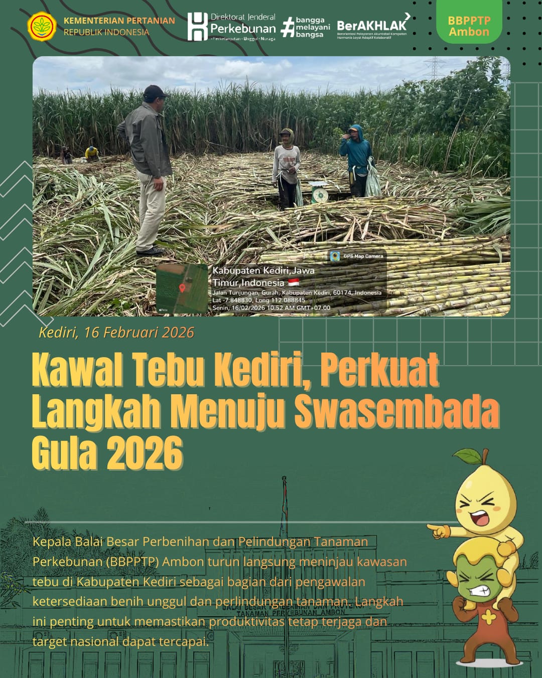 Diposting Senin, 16 Februari 2026 02:02 pmKediri, 16 Februari 2026 – Komitmen tidak hanya di atas kertas, tapi dibuktikan langsung di lapangan. Kepala Balai Besar Perbenihan dan Pelindungan Tanaman Perkebunan (BBPPTP) Ambon turun langsung meninjau kawasan tebu di Kabupaten Kediri sebagai bagian dari pengawalan ketersediaan benih unggul dan perlindungan tanaman. Langkah ini penting untuk memastikan produktivitas tetap terjaga dan target nasional dapat tercapai.