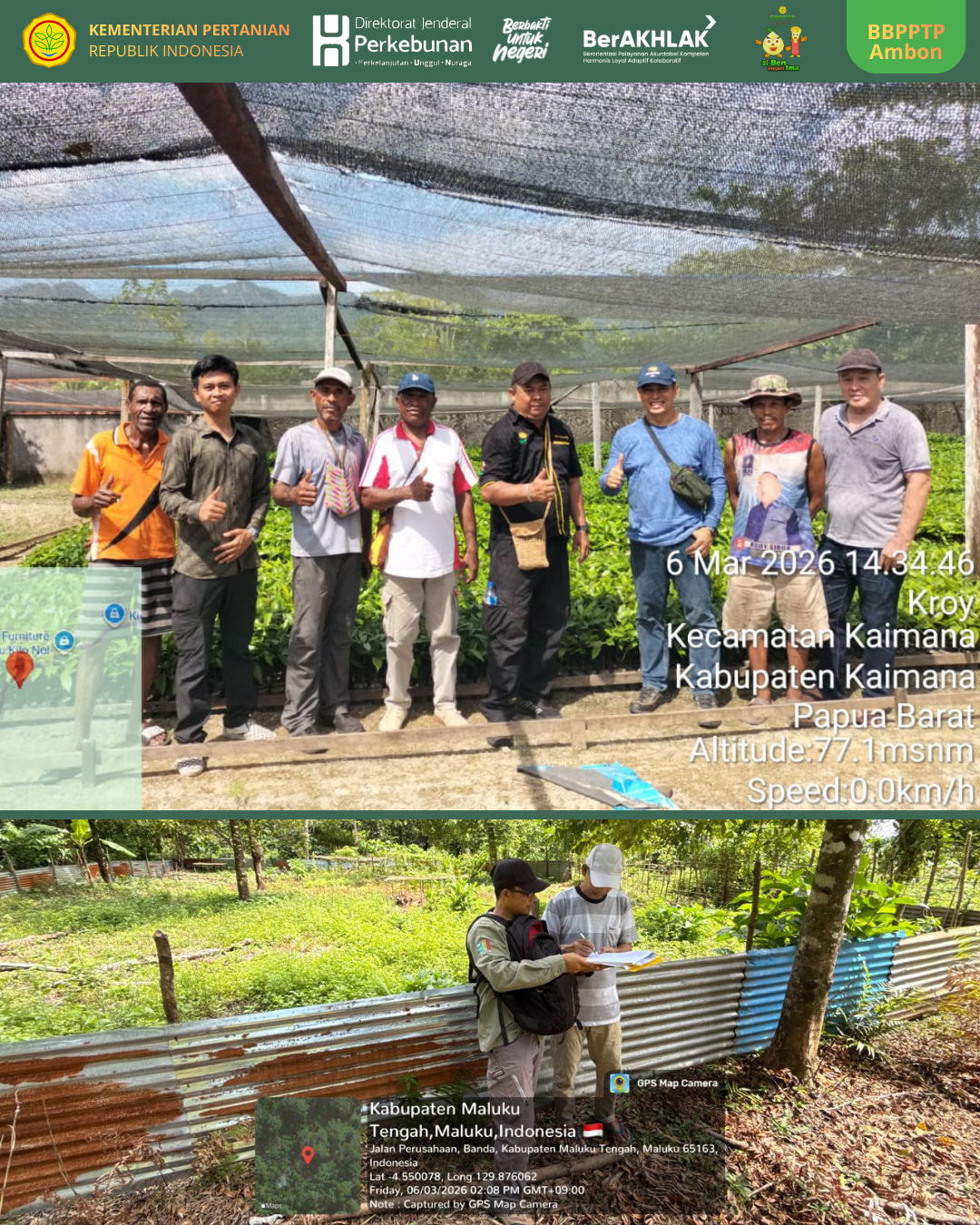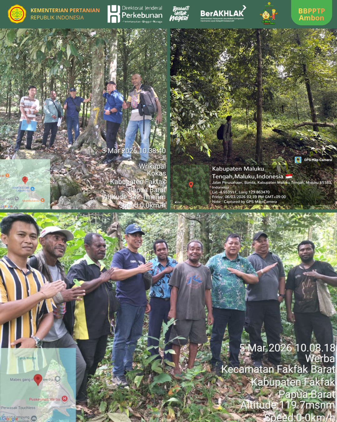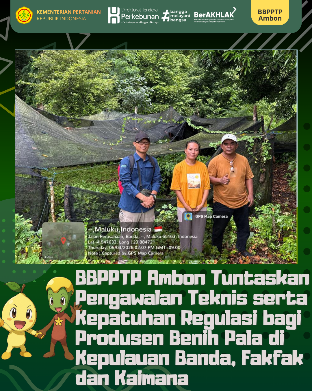 Diposting Senin, 09 Maret 2026 12:03 pmDalam rangka memperkuat kedaulatan rempah di wilayah Timur Indonesia, Balai Besar Perbenihan dan Pelindungan Tanaman Perkebunan (BBPPTP) Ambon telah merampungkan agenda strategis “Pengawalan, Pendampingan, dan Monitoring Evaluasi Kegiatan Produksi Benih Pala di Maluku dan Papua Barat”. Kegiatan yang berlangsung di Kepulauan Banda, Fak Fak, dan Kaimana pada 03 hingga 10 Maret 2026 ini merupakan implementasi nyata dari mandat Direktorat Jenderal Perkebunan untuk memastikan standar mutu di hulu selaras dengan visi hilirisasi nasional.