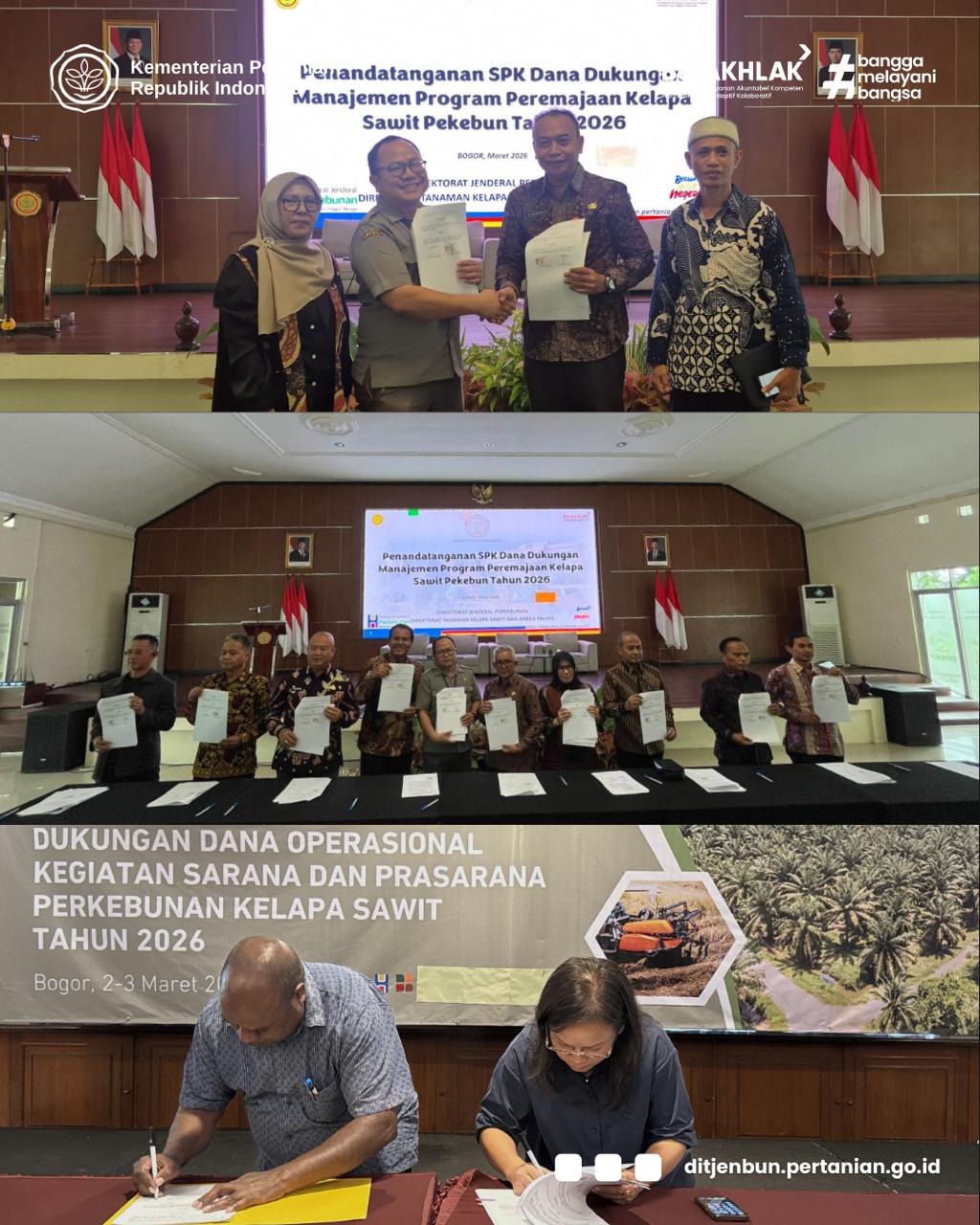 Diposting Kamis, 26 Maret 2026 06:03 amBogor – Kementerian Pertanian (Kementan) terus memperkuat sub sektor perkebunan kelapa sawit sebagai komoditas strategis nasional. Melalui Direktorat Jenderal Perkebunan, Kementan menggelar penandatanganan Surat Perjanjian Kerja Sama (SPK) Dana Dukungan Manajemen Kegiatan Peremajaan Sawit Rakyat (PSR) dan Sarana dan Prasarana (Sarpras) Perkebunan Kelapa Sawit Tahun 2026 bersama satuan kerja (satker) daerah sentra sawit (4/3).