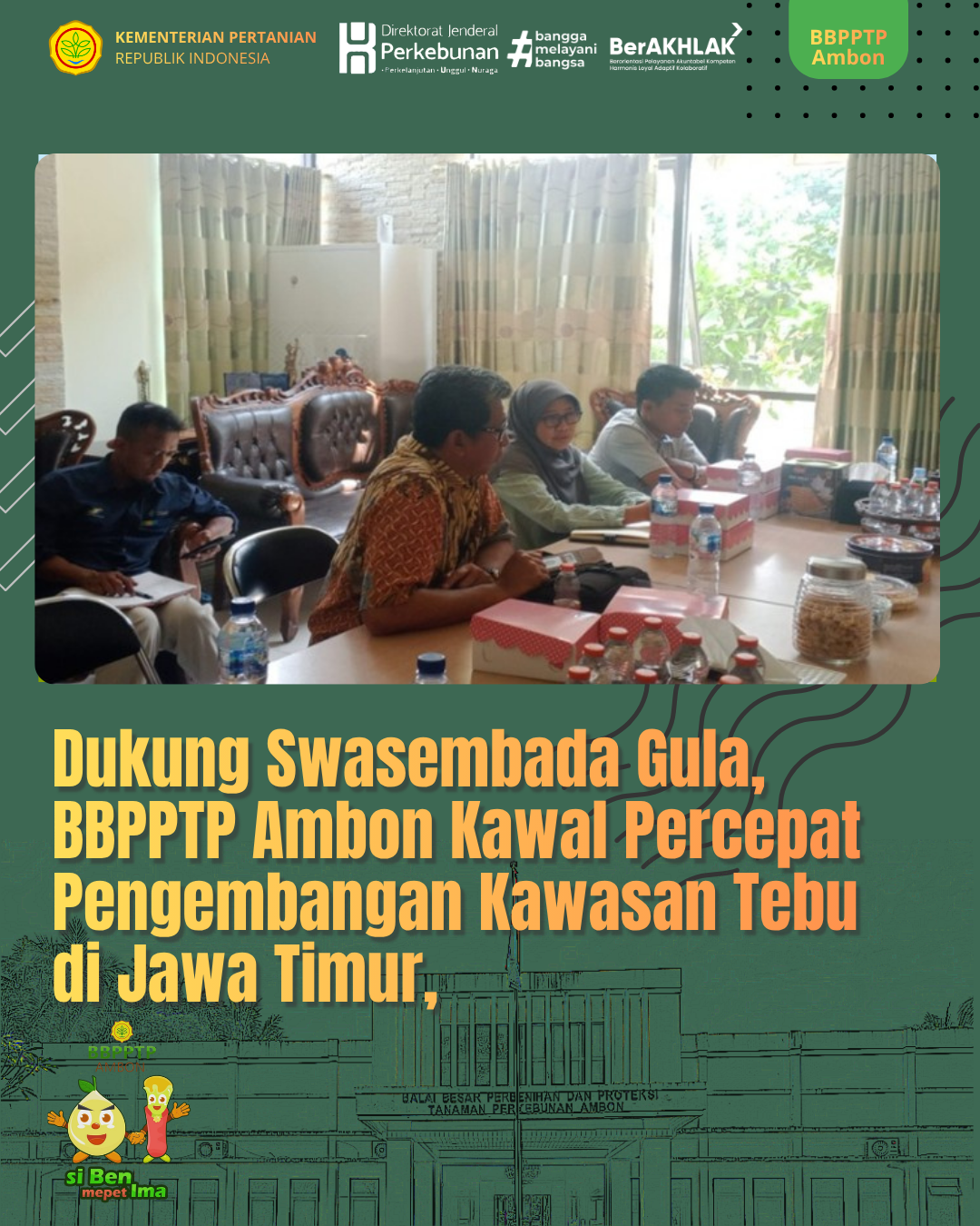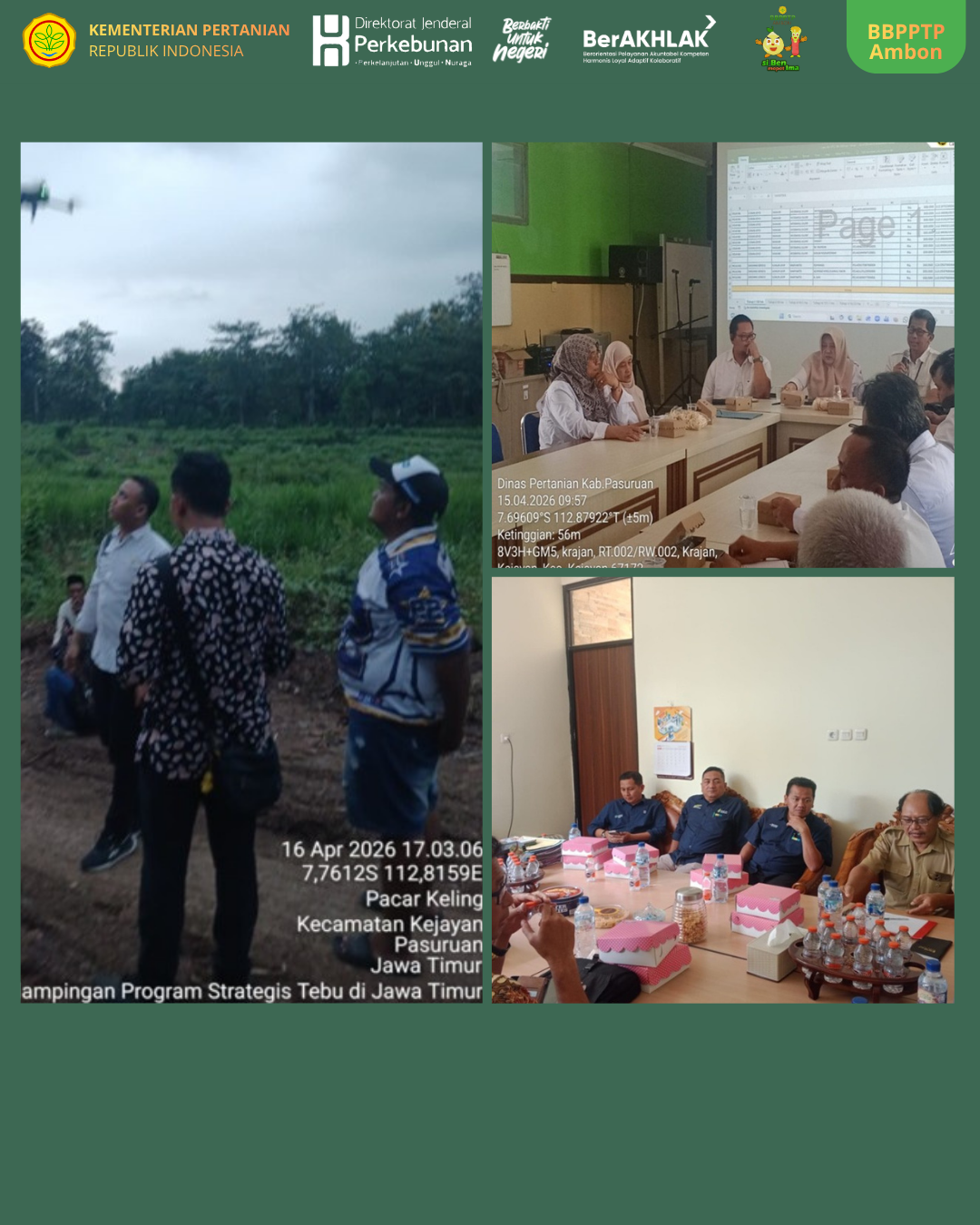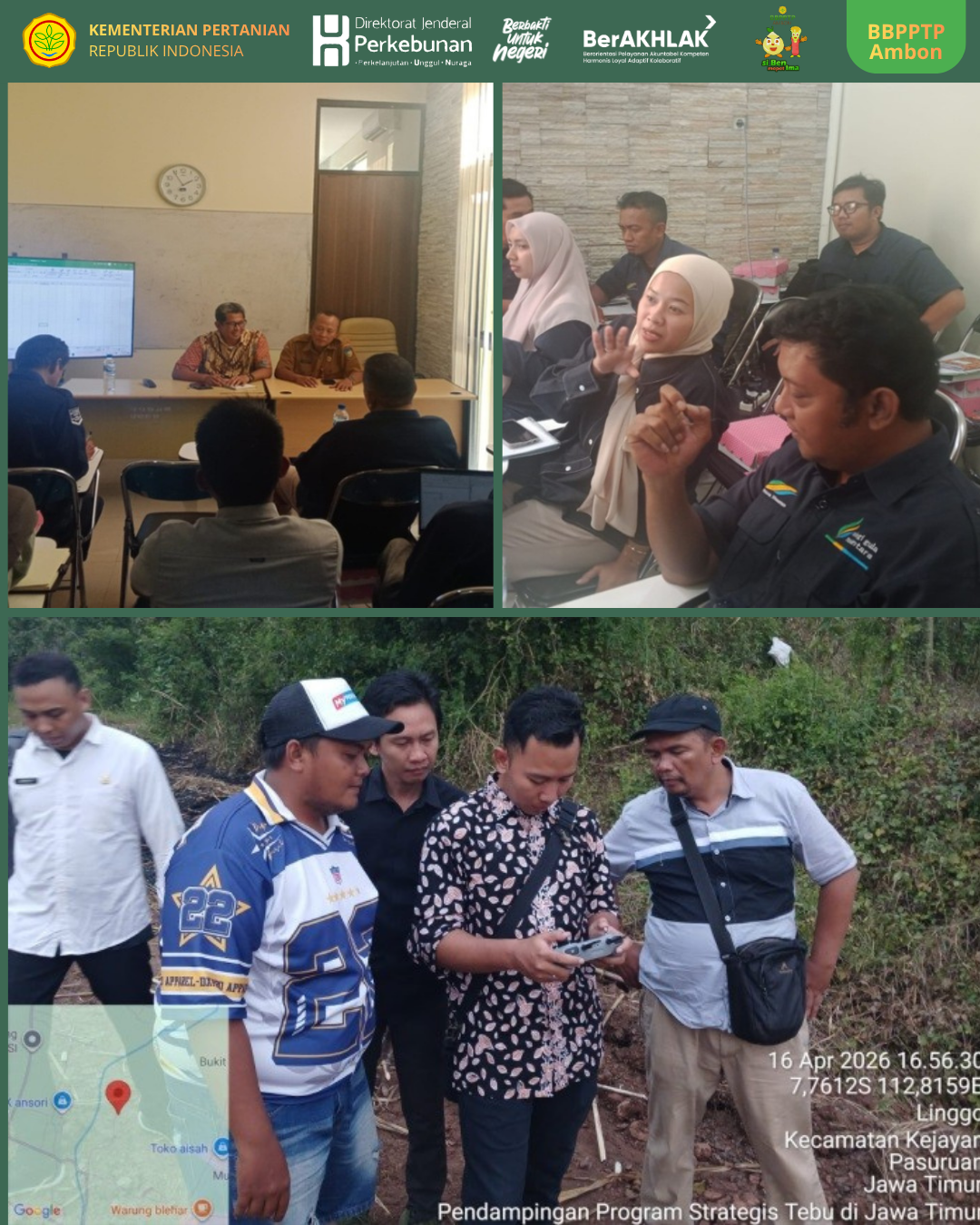 Diposting Selasa, 28 April 2026 06:04 amJawa Timur — Direktorat Jenderal Perkebunan Melalui BBPPTP Ambon terus mendorong percepatan pengembangan kawasan tebu sebagai langkah strategis menuju swasembada gula nasional. Upaya tersebut diwujudkan melalui kegiatan perjalanan dinas dan koordinasi lintas daerah yang dilaksanakan di Provinsi Jawa Timur, khususnya di Kabupaten Kediri dan Kabupaten Pasuruan.